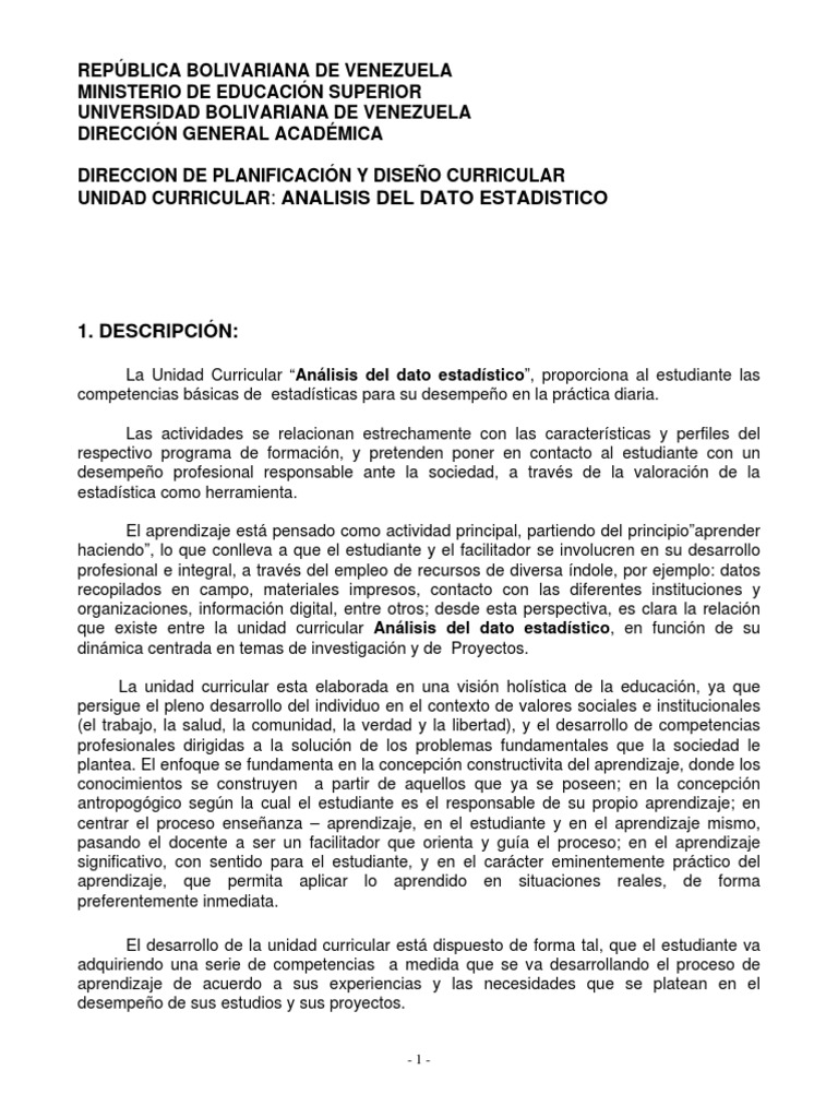 La Unidad Curricular “Análisis del dato estadístico”, proporciona al estudiante las
