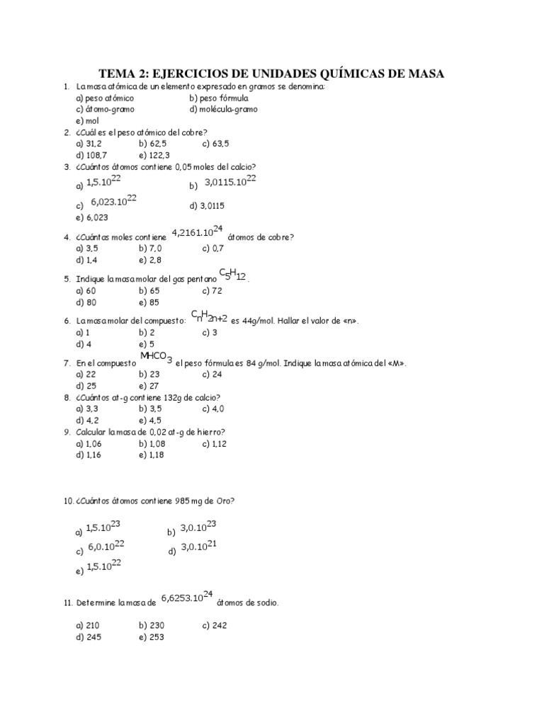 TEMA 2: EJERCICIOS DE UNIDADES QUÍMICAS DE MASA