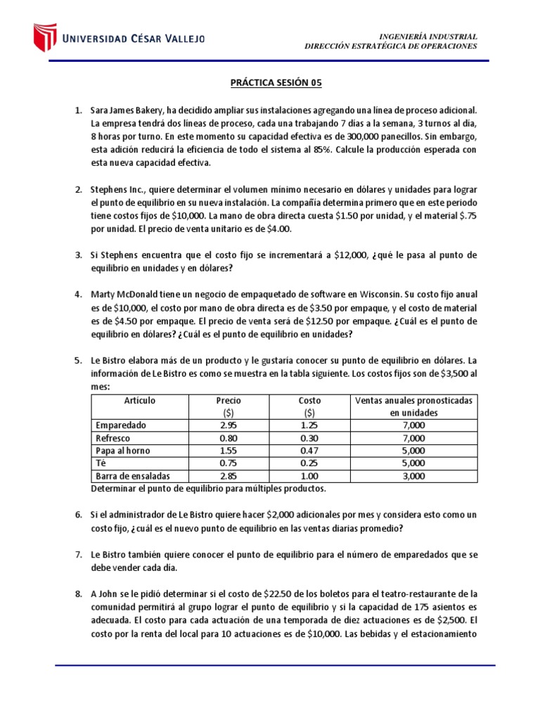 5. Le Bistro elabora más de un producto y le gustaría conocer su punto de equilibrio en dólares. La