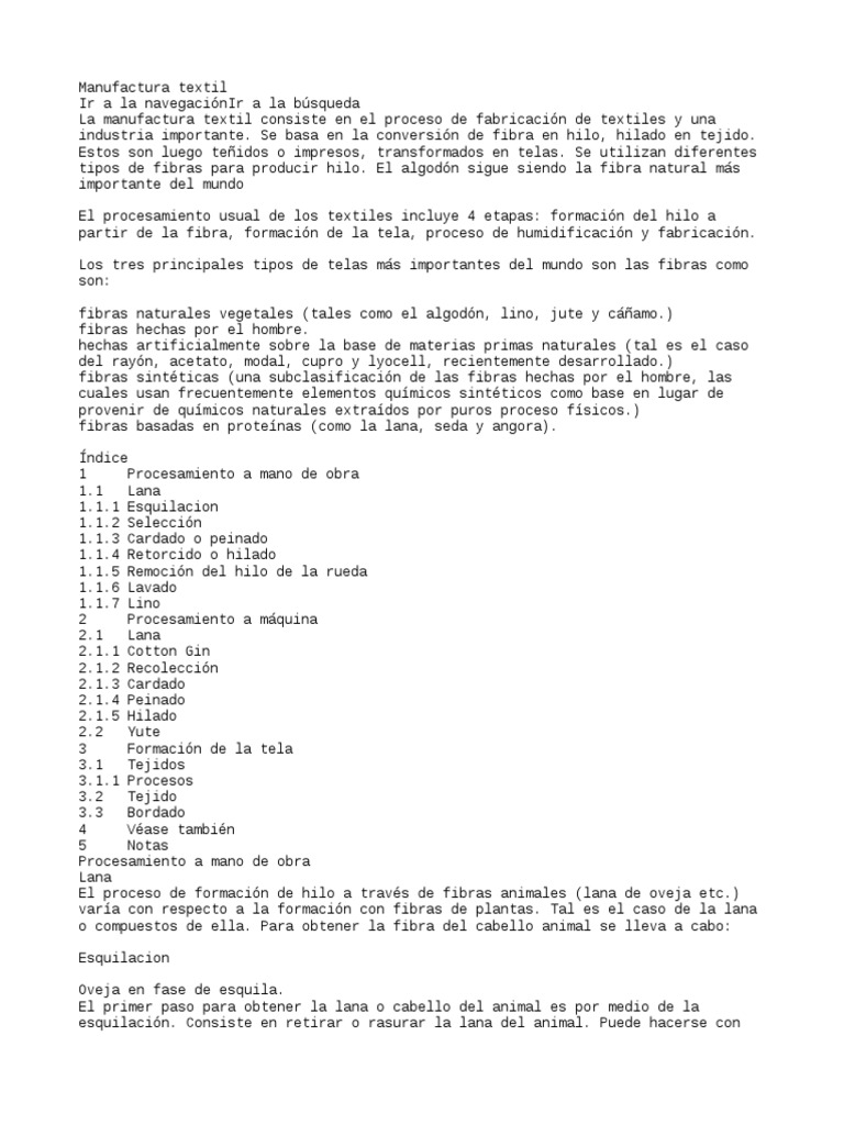 El procesamiento usual de los textiles incluye 4 etapas: formación del hilo a