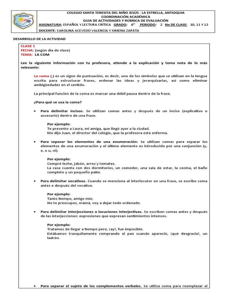 ASIGNATURA: ESPAÑOL Y LECTURA CRÍTICA GRADO: 6° PERIODO: 2 No DE CLASE: 10, 11 Y 12