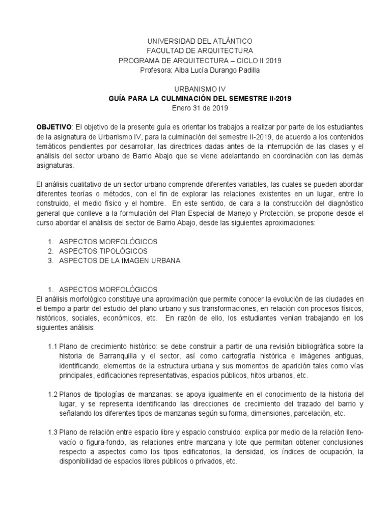 de la asignatura de Urbanismo IV, para la culminación del semestre II-2019, de acuerdo a los contenidos