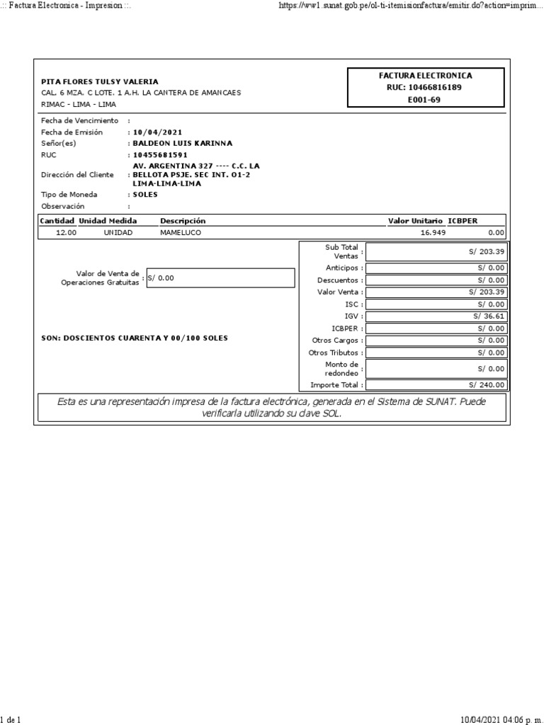 Esta es una representación impresa de la factura electrónica, generada en el Sistema de SUNAT. Puede