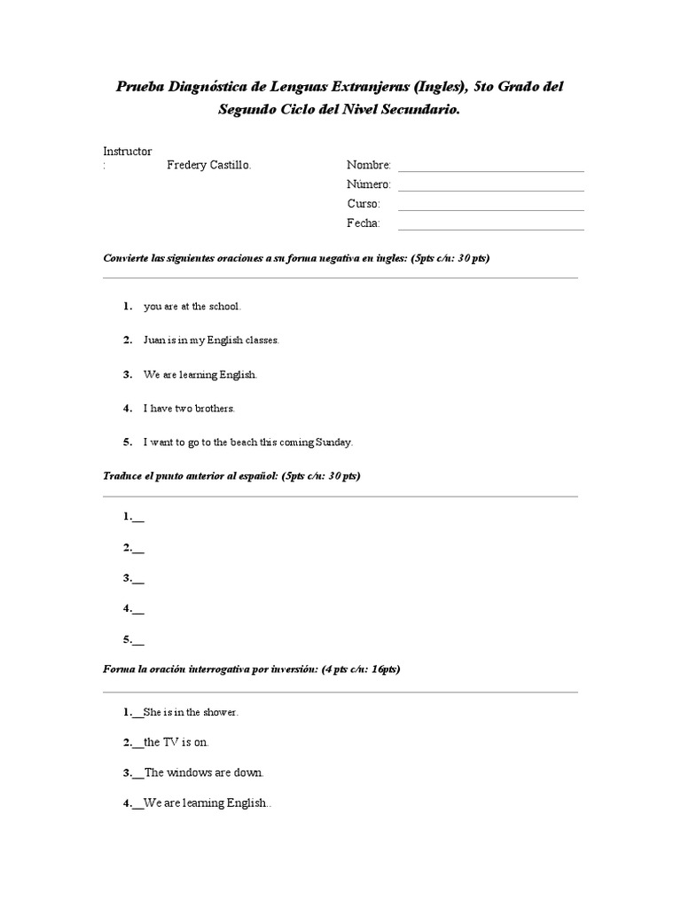 Prueba Diagnóstica de Lenguas Extranjeras (Ingles), 5to Grado del