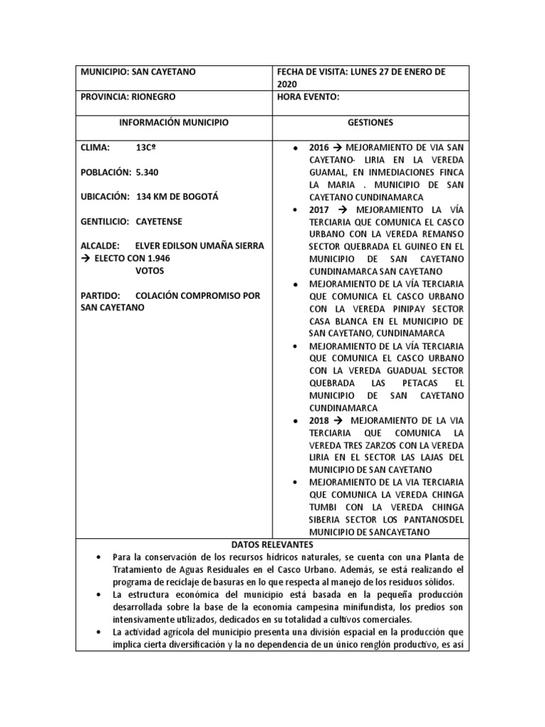 MUNICIPIO: SAN CAYETANO FECHA DE VISITA: LUNES 27 DE ENERO DE