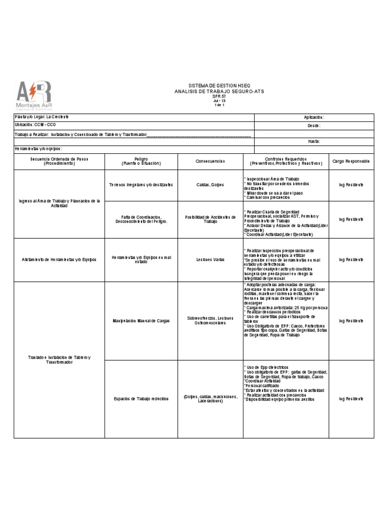 Cableado de Tablero y Transformador Manipulacion Herramientas Menores Golpes, machucones, Laceraciones * Disponibilidad de equipo Primeros Auxilios Ingeniero Residente