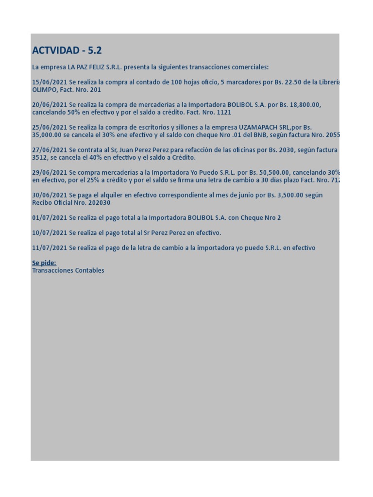 La empresa LA PAZ FELIZ S.R.L. presenta la siguientes transacciones comerciales: