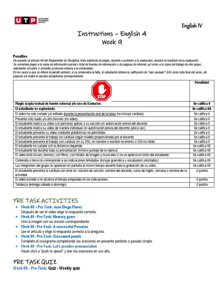 El estudiante presenta la carátula con error en: número de sección, nombre del docente, curso de inglés, semana o nombre de la -3 puntos