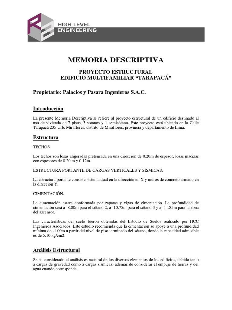 La presente Memoria Descriptiva se refiere al proyecto estructural de un edificio destinado al