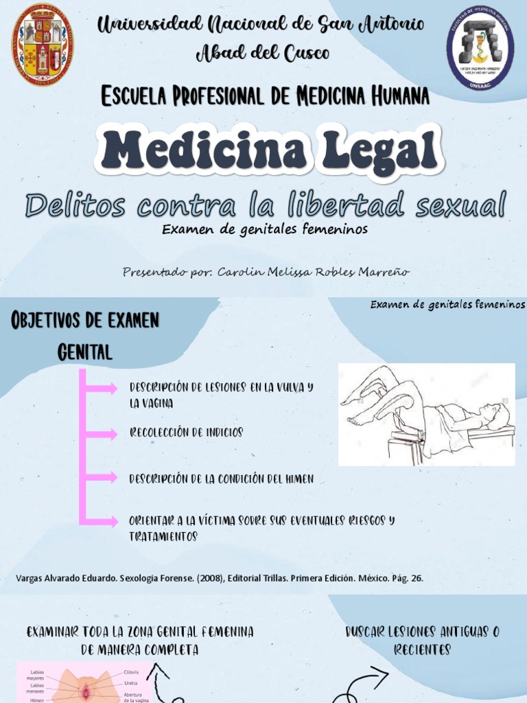 Examinar toda la zona genital femenina Buscar lesiones antiguas o