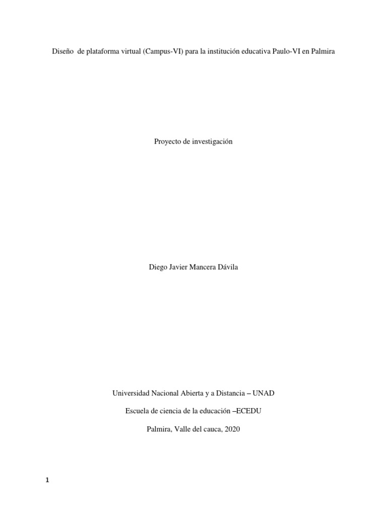 Descripción Proyecto de investigación que busca diseñar e implementar una plataforma virtual para