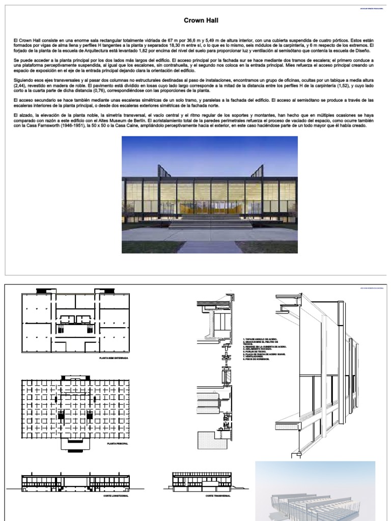 El Crown Hall consiste en una enorme sala rectangular totalmente vidriada de 67 m por 36,6 m y 5,49 m de altura interior, con una cubierta suspendida de cuatro pórticos. Estos están