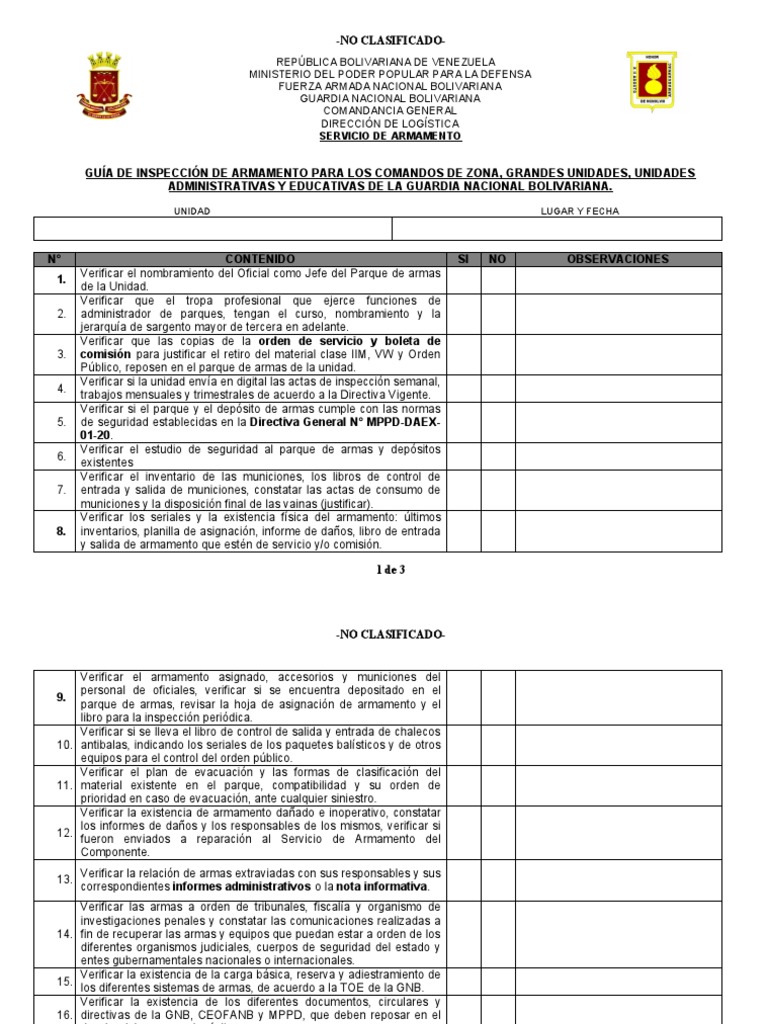 parque de armas, revisar la hoja de asignación de armamento y el