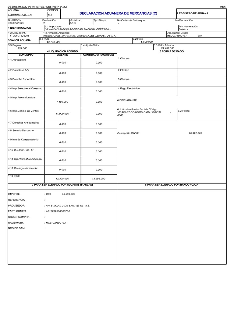 7 PARA SER LLENADO POR ADUANAS (FIANZAS) 8 PARA SER LLENADO POR BANCO / CAJA