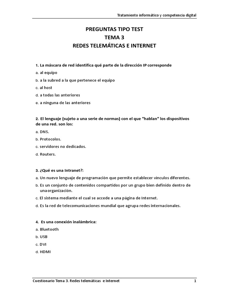 Cuestionario Tema 3. Redes telemáticas e Internet 1