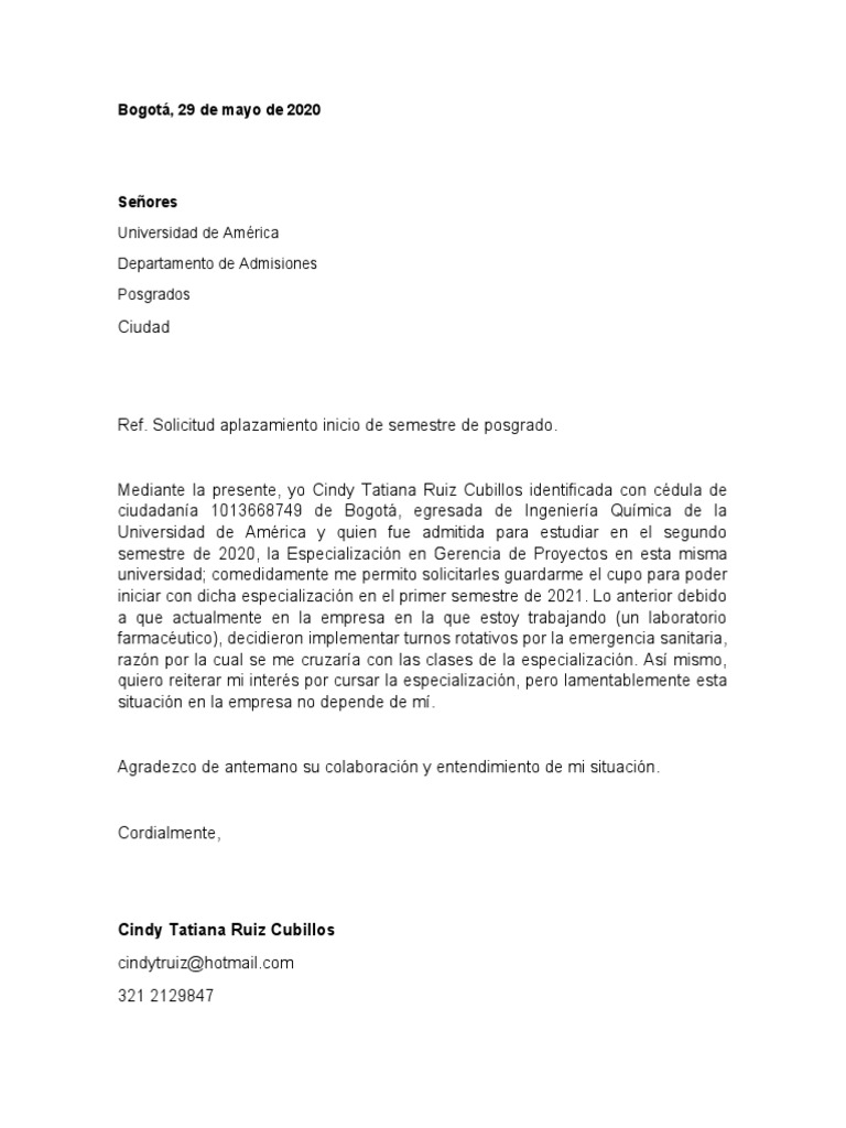universidad; comedidamente me permito solicitarles guardarme el cupo para poder