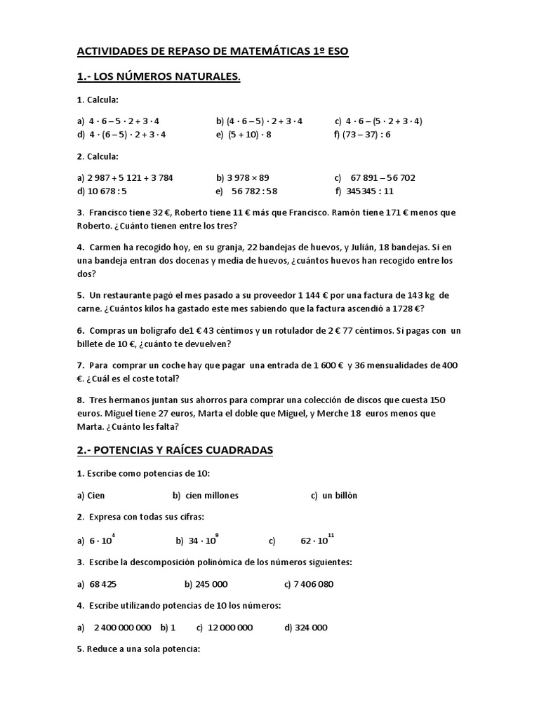 Actividades de Repaso de Matemáticas 1º Eso