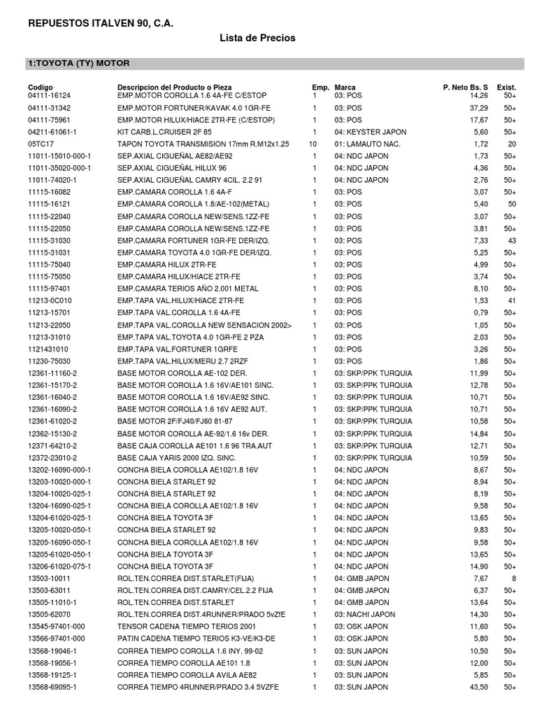 Codigo Descripcion del Producto o Pieza Emp. Marca P. Neto Bs. S Exist.