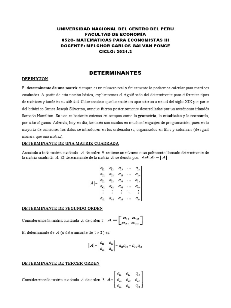 Asociado a toda matriz cuadrada A de orden n se tiene un número o un polinomio llamado determinante de