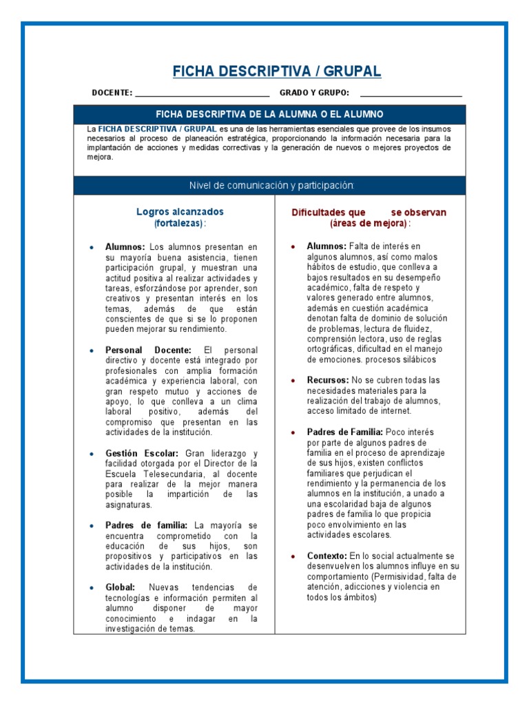 La FICHA DESCRIPTIVA / GRUPAL es una de las herramientas esenciales que provee de los insumos