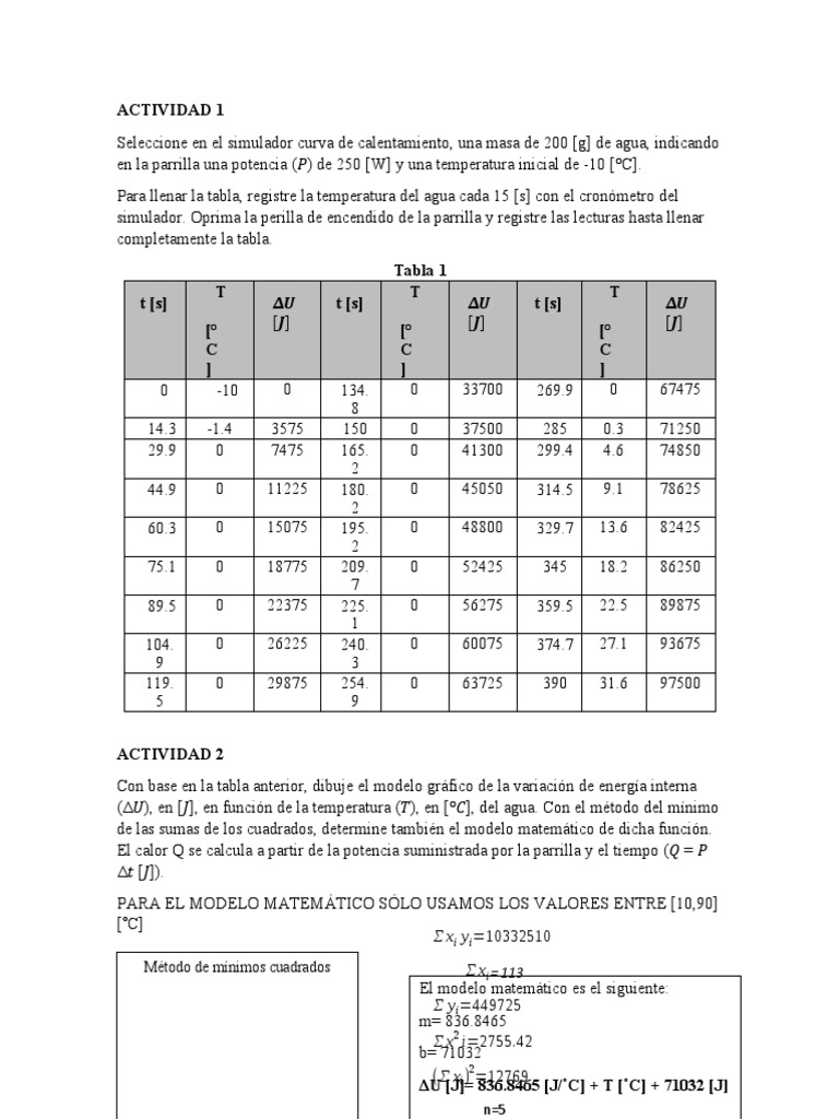 (Δ𝑈), en [𝐽], en función de la temperatura (𝑇), en [°𝐶], del agua. Con el método del mínimo