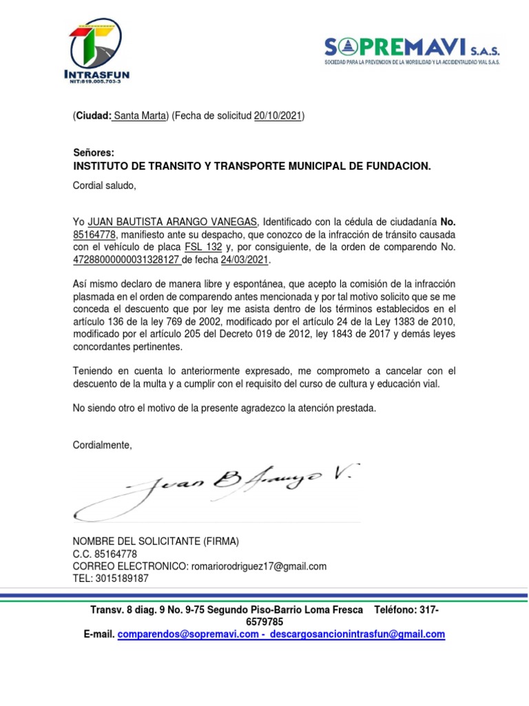 plasmada en el orden de comparendo antes mencionada y por tal motivo solicito que se me