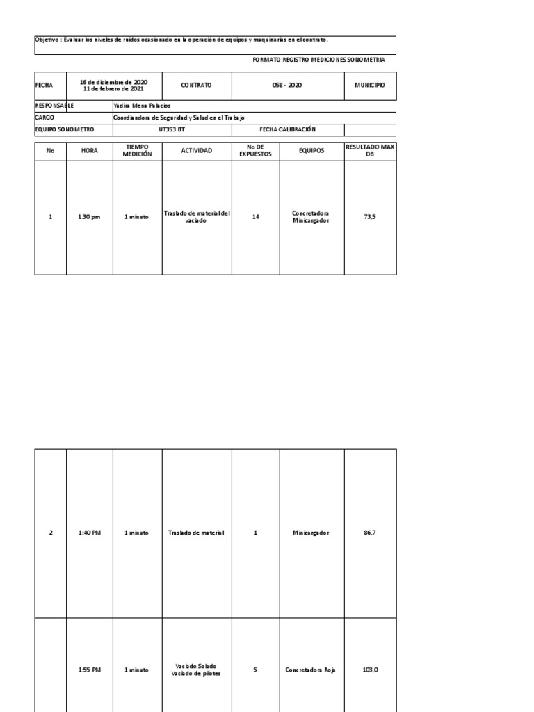 Objetivo : Evaluar los niveles de ruidos ocasionado en la operación de equipos y maquinarias en el contrato.