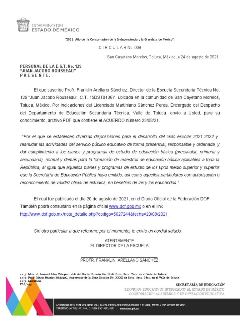 del Departamento de Educación Secundaria Técnica, Valle de Toluca. envío a Usted, para su