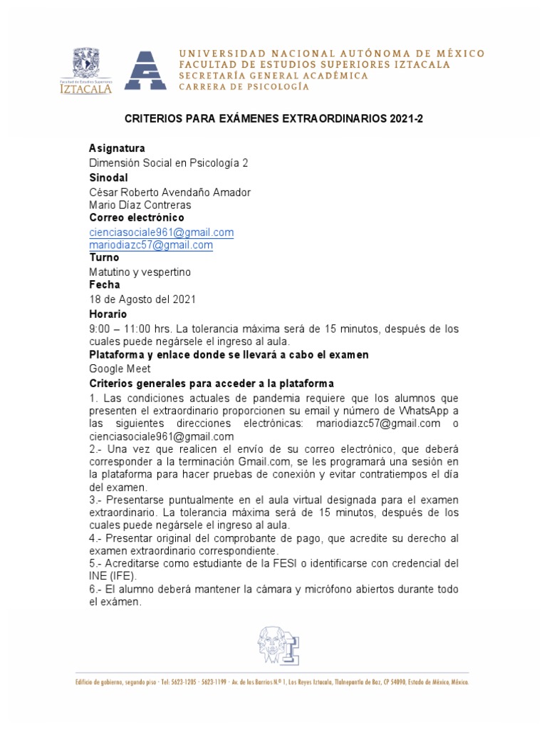 Criterios de evaluación del examen extraordinario a presentar