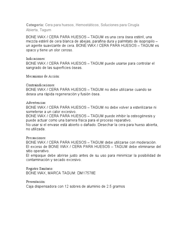 BONE WAX / CERA PARA HUESOS – TAGUM debe utilizarse con moderación.
