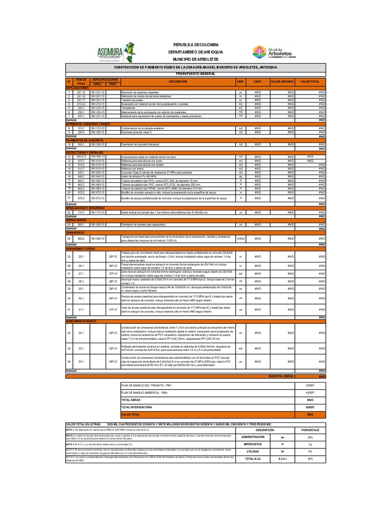 NOTA 3: El A.I.U. y su discriminación deben estar en porcentaje (%). IMPREVISTOS I= 1%