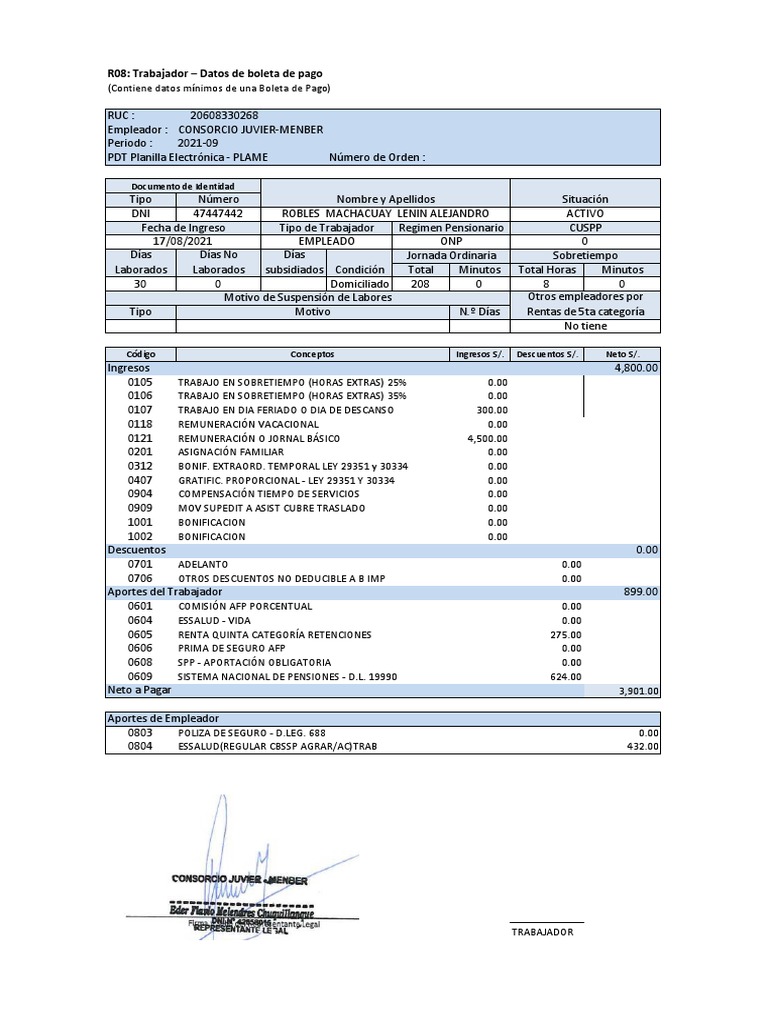 (Contiene datos mínimos de una Boleta de Pago)