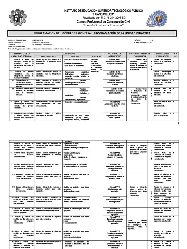 UNIDAD DIDÁCTICA : ESTADISTICA GENERAL HORAS SEMANALES : 02