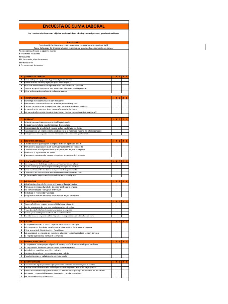 Este cuestionario tiene como objetivo analizar el clima laborla y como el personal percibe el ambiente.