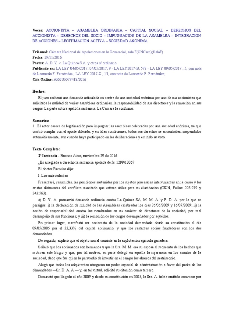 toda la sustanciación del juicio, el carácter de accionista de la sociedad demandada (confr. N. R. A., “Ley de
