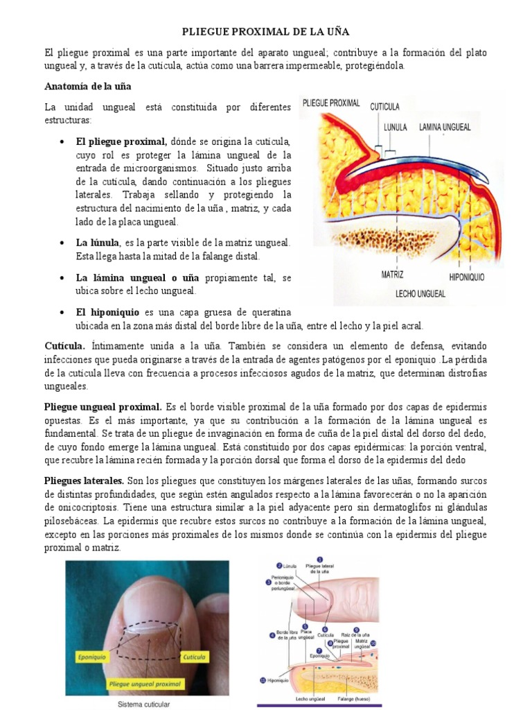 Pliegue ungueal proximal. Es el borde visible proximal de la uña formado por dos capas de epidermis