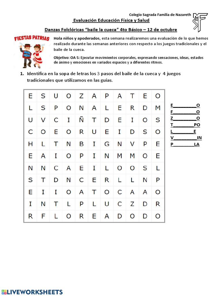 1. Identifica en la sopa de letras los 3 pasos del baile de la cueca y 4 juegos