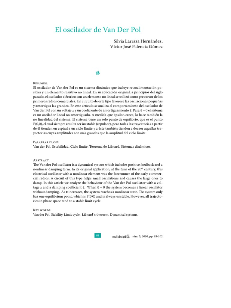 Van der Pol. Stability. Limit cycle. Liènard´s theorem. Dynamical systems.