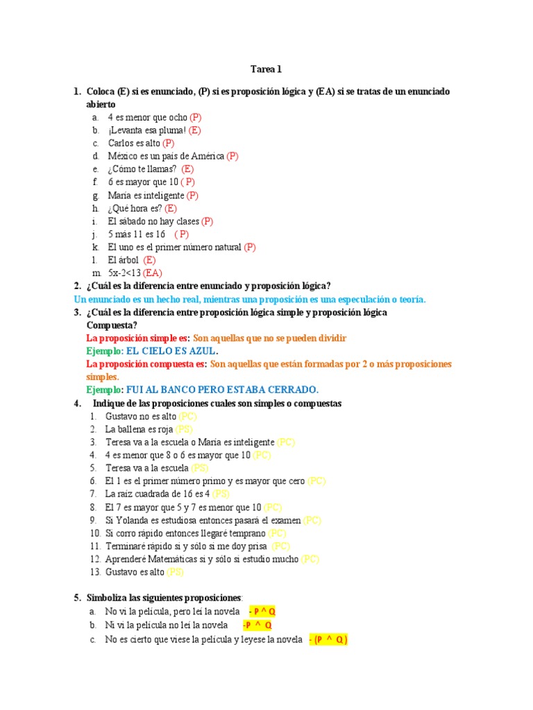 1. Coloca (E) si es enunciado, (P) si es proposición lógica y (EA) si se tratas de un enunciado