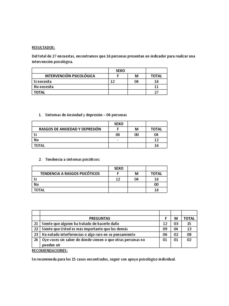 Se recomienda para los 15 casos encontrados, seguir con apoyo psicológico individual.