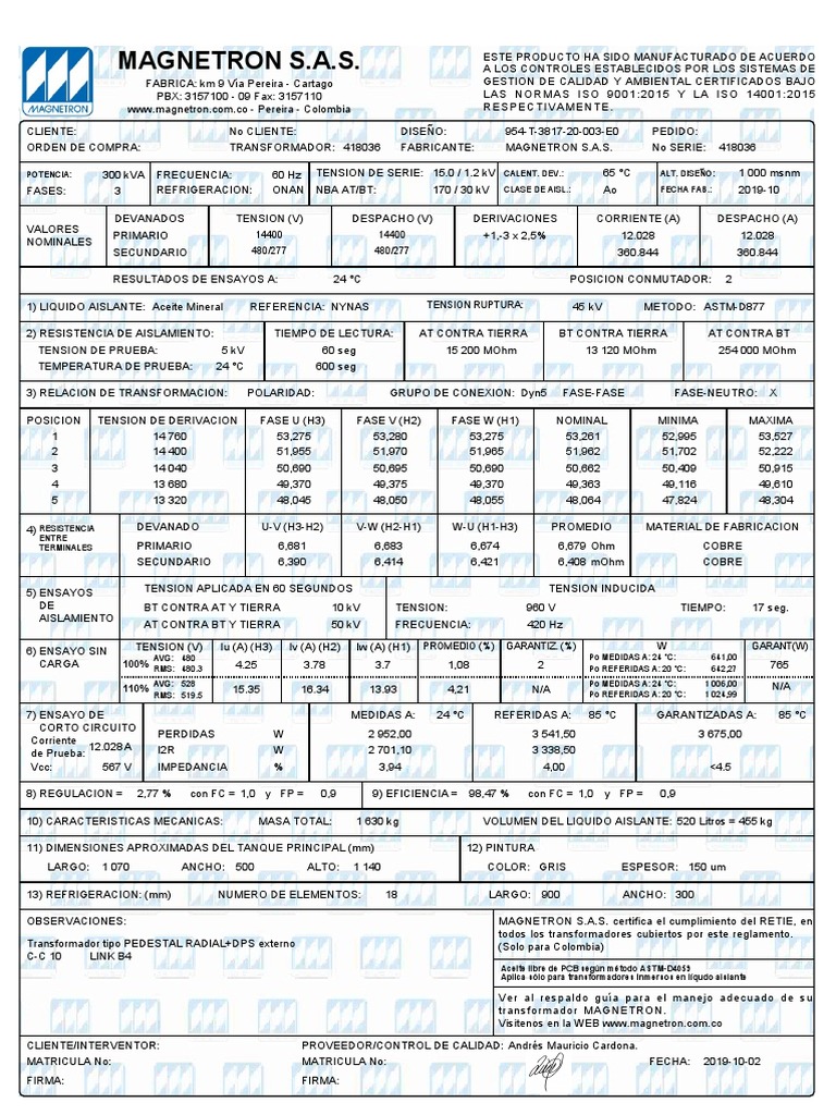 ORDEN DE COMPRA: TRANSFORMADOR: 418036 FABRICANTE: MAGNETRON S.A.S. No SERIE: 418036