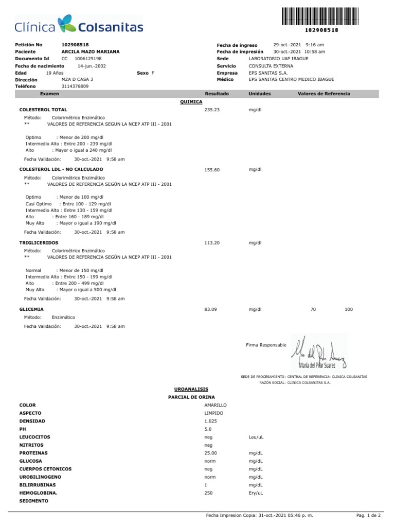 Paciente ARCILA MAZO MARIANA Fecha de impresión 30-oct.-2021 10:58 am
