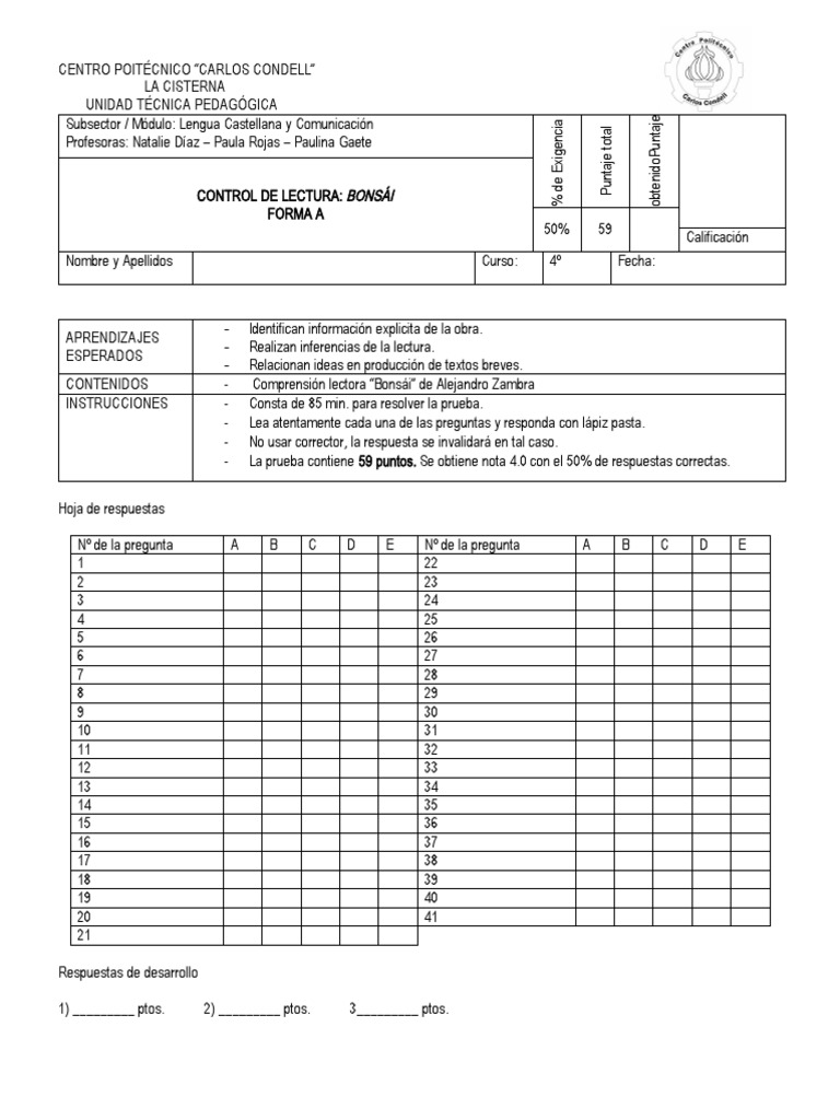 - La prueba contiene 59 puntos. Se obtiene nota 4.0 con el 50% de respuestas correctas.