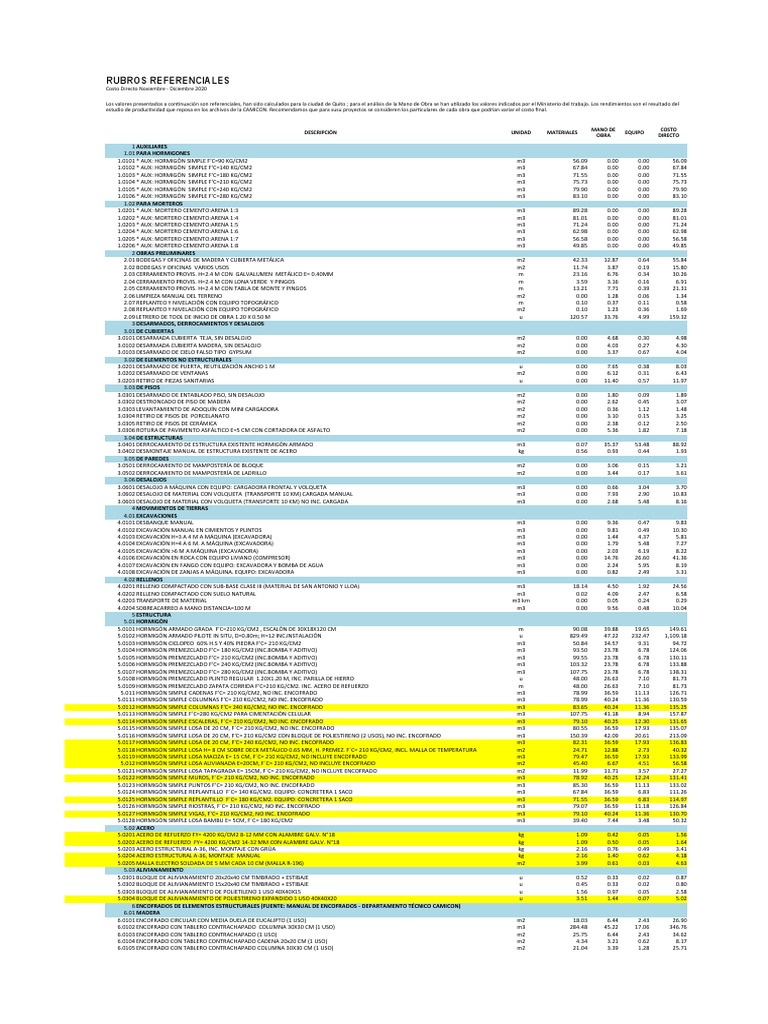Los valores presentados a continuación son referenciales, han sido calculados para la ciudad de Quito ; para el análisis de la Mano de Obra se han utilizado los valores indicados por el Ministerio del trabajo. Los rendimientos son el resultado del