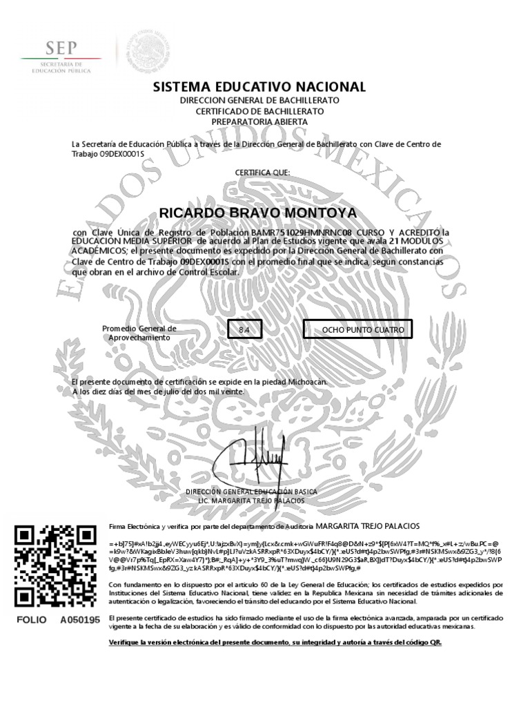 FOLIO A050195 El presente certificado de estudios ha sido firmado mediante el uso de la firma electrónica avanzada, amparada por un certificado