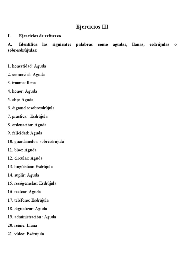 A. Identifica las siguientes palabras como agudas, llanas, esdrújulas o