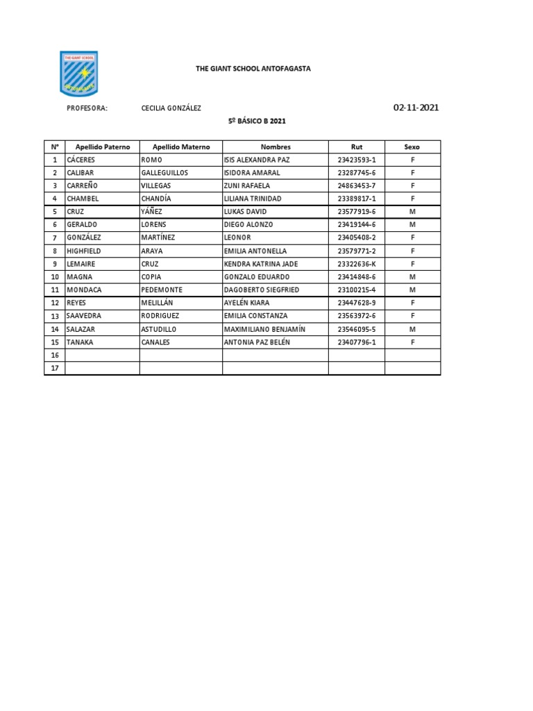 N° Apellido Paterno Apellido Materno Nombres Rut Sexo