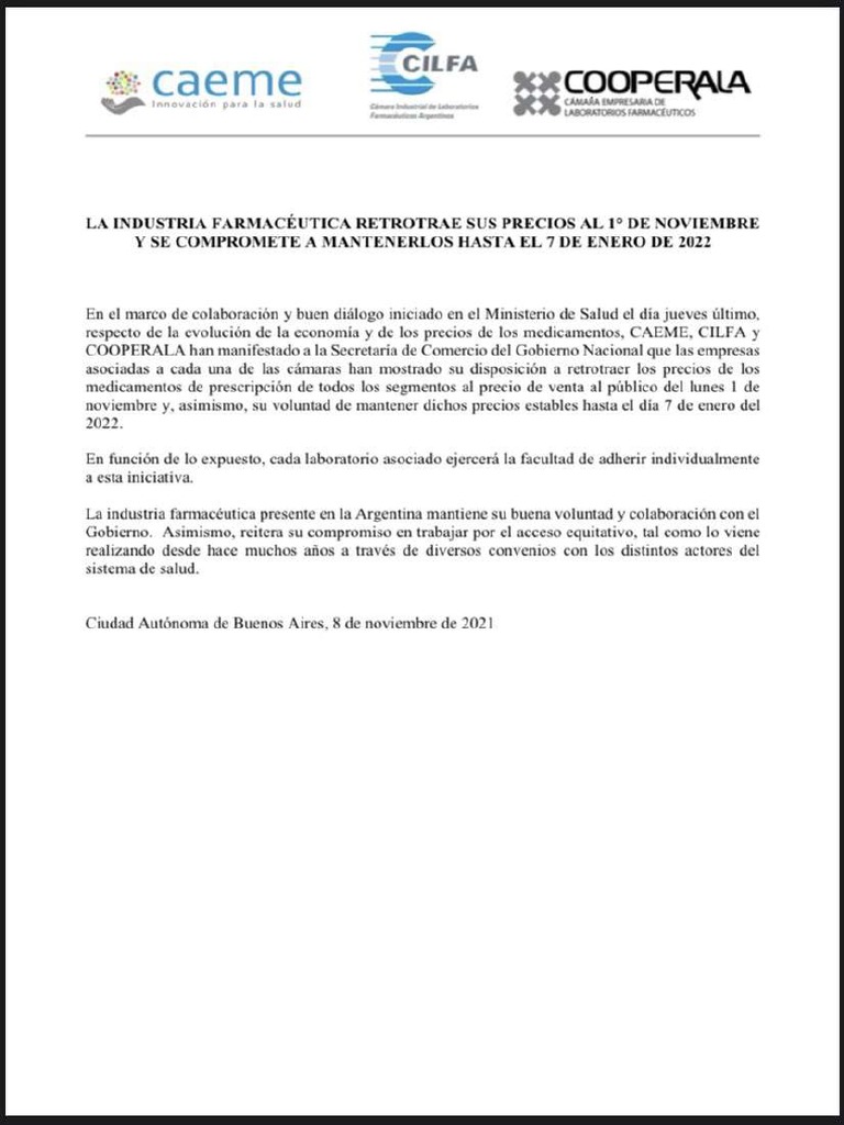 La industria farmacéutica presente en la Argentina mantiene su buena voluntad y colaboracién con el