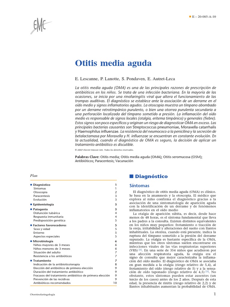 Cualquier referencia a este artículo debe incluir la mención del artículo original: Lescanne E., Lanotte P., Pondaven S., Autret-Leca E. Otites