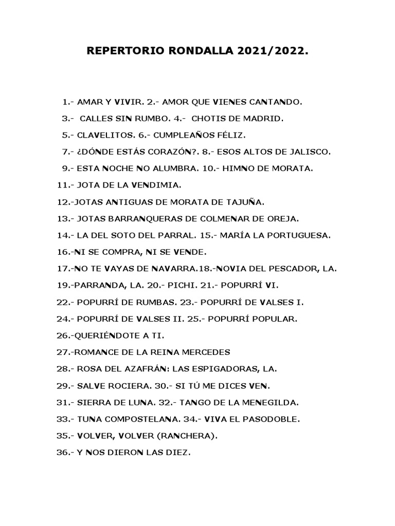 Este documento presenta un repertorio de 36 canciones que la rondalla interpretará durante la temporada 2021/2022. Incluye diversos géneros como jotas, valses, rancheras y popurrís de diferentes estilos musicales.